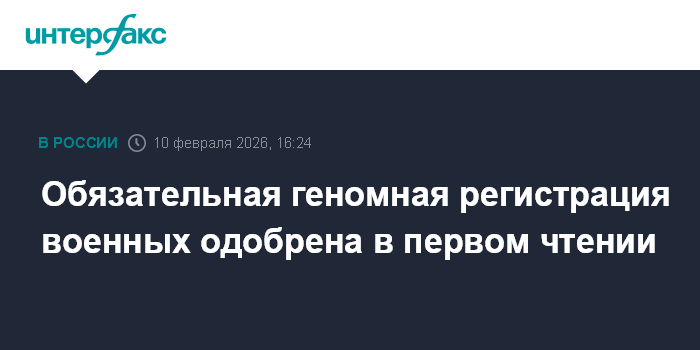 Москва. 10 февраля. INTERFAX.RU - Госдума приняла в первом чтении законопроект № 1131086-8 об обязательной государственной геномной регистрации для отдельных категорий лиц, проходящих военную службу.