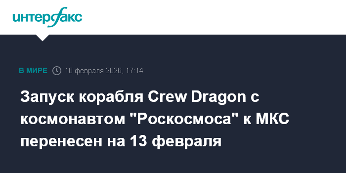 "По информации NASA, запуск корабля Crew Dragon с (российским космонавтом - ИФ) Андреем Федяевым к МКС перенесен на 13 февраля из-за погодных условий", - говорится в сообщении.
