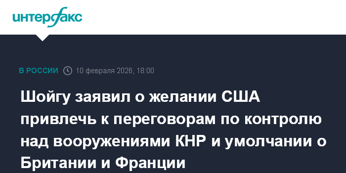 Москва. 10 февраля. INTERFAX.RU - Секретарь Совета безопасности РФ Сергей Шойгу заявил, что США хотят привлечь Китай к переговорам по контролю над вооружениями, при этом Вашингтон не говорит о необходимости задействовать в дискуссии другие ядерные державы - Великобританию и Францию.