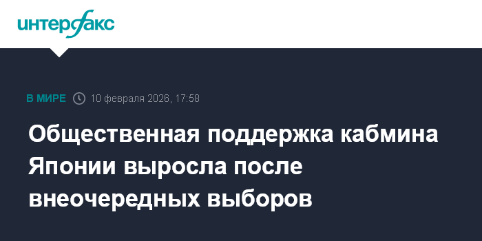 Москва. 10 февраля. INTERFAX.RU - Уровень общественного одобрения кабмина Японии во главе с премьером Санаэ Такаити после недавних внеочередных выборов растет. Об этом сообщает во вторник Kyodo со ссылкой на данные проведенного этим агентством опроса общественного мнения.