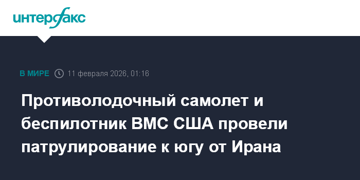 Москва. 11 февраля. INTERFAX.RU - Патрульный противолодочный самолет P-8A Poseidon и дальний беспилотник радиоэлектронной разведки MQ-4C Triton ВМС США во вторник один за другим провели многочасовые полеты к юго-востоку от Ирана, следует из данных авиационного ресурса Flightradar24.
