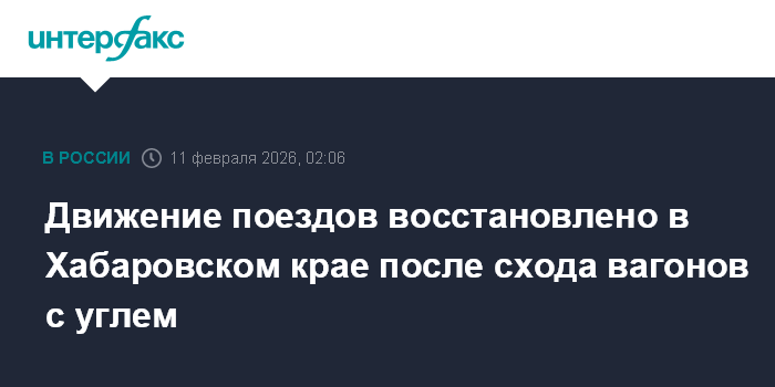 Москва. 11 февраля. INTERFAX.RU - На перегоне Датта-Кенада между станциями Высокогорная и Советская Гавань в Хабаровском крае восстановлено движение поездов, прерванное в понедельник после схода вагонов с углем, сообщает пресс-служба регионального ГУ МЧС России в среду.