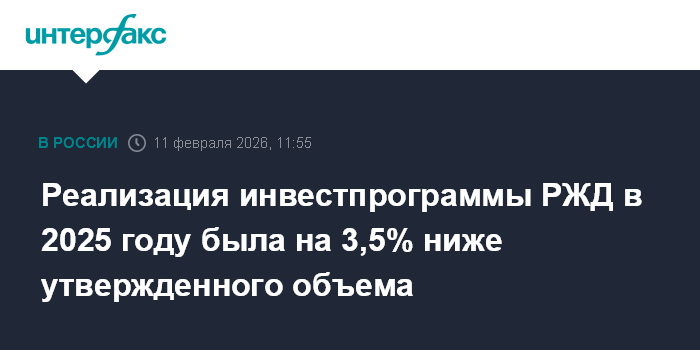 Москва. 11 февраля. INTERFAX.RU - Реализация инвестпрограммы ОАО "РЖД" в 2025 году составила более 860 млрд рублей, сообщил глава компании Олег Белозеров на итоговом заседании правлении РЖД.