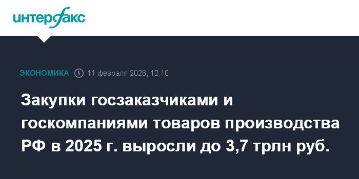В Минпромторге "Интерфаксу" уточнили, что в 2025 году госзаказчики закупили товары на 2,82 трлн рублей, а госкомпании - на 2,15 трлн рублей. Всего - на 4,97 трлн рублей. Из них на приобретение именно российских (или из стран ЕАЭС) товаров пошло, соответственно, 1,87 трлн и 1,85 трлн рублей.