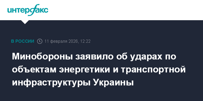 Москва. 11 февраля. INTERFAX.RU - Российские военные в течение суток нанесли удары по используемым в интересах ВСУ объектам энергетики и транспортной инфраструктуры Украины, сообщило министерство обороны РФ в среду.