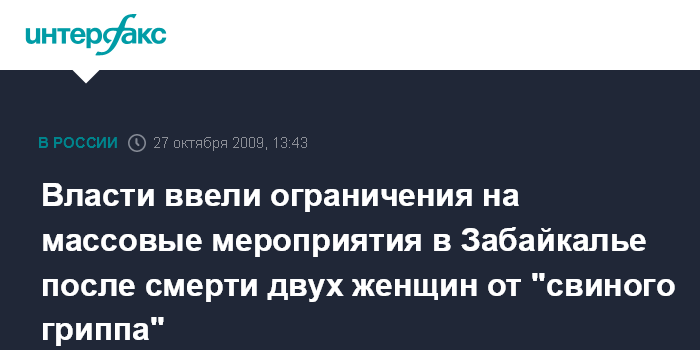 Москва. 27 октября. INTERFAX.RU - В Забайкальском крае, где отмечен рост заболеваемости гриппом и две женщины умерли от свиного гриппа, введены ограничения на массовые мероприятия, сообщили в Роспотребнадзоре. "В Забайкальском крае зарегистрировано два случая заболеваний пандемическим гриппом, осложненных пневмонией, которые закончились летальным исходом. Погибшие больные за пределы Забайкальского края не выезжали", - говорится в сообщении Роспотребнадзора, распространенном в Москве во вторник.