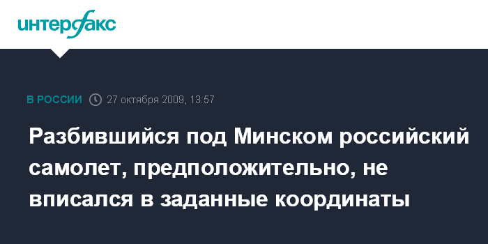 Москва. 27 октября. INTERFAX.RU - Разбившийся минувшей ночью под Минском российский самолет, по предварительной информации, не вписался в заданные координаты, сообщили агентству "Интерфакс-Запад" во вторник в Транспортной прокуратуре Белоруссии.