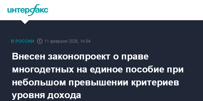 Москва. 11 февраля. INTERFAX.RU - Правительство внесло в Госдуму законопроект, сохраняющий право на единое пособие для многодетных семей, чьи доходы превысят величину прожиточного минимума на 10%, заявил премьер РФ Михаил Мишустин.