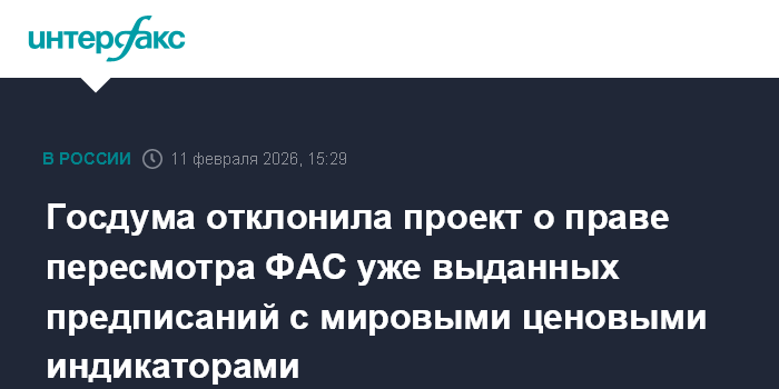 Москва. 11 февраля. INTERFAX.RU - Госдума на заседании в среду отклонила принятый в первом чтении правительственный законопроект, который который наделял федеральную антимонопольную службу (ФАС) правом пересматривать старые предписания и менять в них условия ценообразования, если в них использовались мировые индикаторы, в новой ситуации не соответствующие общим условиям обращения товара. В таком случае регулятор наделялся правом предписать использовать российскую биржу, сопоставимый рынок в РФ или затратный метод.