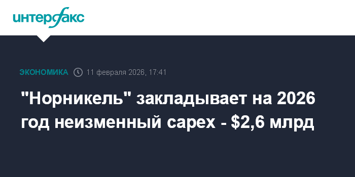 Москва. 11 февраля. INTERFAX.RU - Капвложения ГМК "Норильский никель" в 2026 году могут составить $2,6 млрд, говорится в презентации компании, посвященной публикации отчетности за прошедший год.
