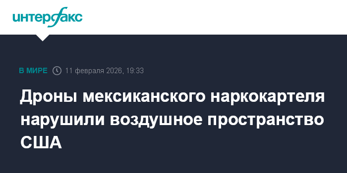 Москва. 11 февраля. INTERFAX.RU - Дроны одного из мексиканских наркокартелей вошли в воздушное пространство США, что привело к временному запрету полетов для гражданских бортов над Эль-Пасо (штат Техас) на юге страны, сообщает телеканал CNN со ссылкой на источник.