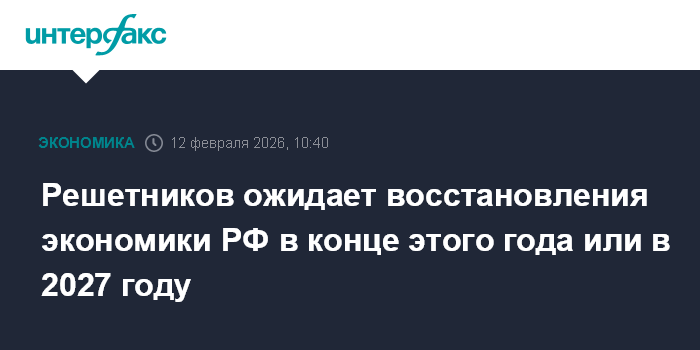 Москва. 12 февраля. INTERFAX.RU - Экономика РФ в I полугодии 2026 года продолжит замедляться, восстановление ожидается в лучшем случае в конце 2026 года, скорее всего в 2027 году, заявил глава Минэкономразвития Максим Решетников, выступая в четверг в Госдуме на заседании комитета по экономполитике.