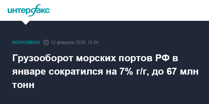 Москва. 12 февраля. INTERFAX.RU - Грузооборот морских портов РФ в январе 2026 г. уменьшился на 7% по сравнению с аналогичным периодом 2025 г. и составил 66,9 млн тонн, сообщается на сайте Ассоциации морских торговых портов (АСОП).