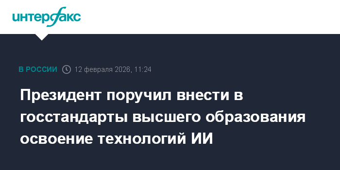 Москва. 12 февраля. INTERFAX.RU - Президент Владимир Путин поручил правительству РФ совместно с комиссией Госсовета по направлению "Экономика данных" обеспечить внесение в федеральные государственные образовательные стандарты высшего образования освоение технологий искусственного интеллекта.