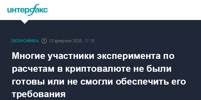 Москва. 12 февраля. INTERFAX.RU - Многие участники эксперимента (ЭПР) по трансграничным расчетам криптовалютой не были готовы инвестировать столько, чтобы обеспечить все его требования, либо просто не могли этого сделать, заявил первый зампред ЦБ Владимир Чистюхин.