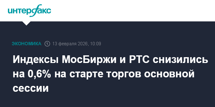 Москва. 13 февраля. INTERFAX.RU - Российский рынок акций на старте торгов основной сессии на МосБирже в пятницу корректируется вниз на фоне ухудшения внешней фондовой и сырьевой конъюнктуры (нефть Brent просела к $67,5 за баррель), инвесторы ожидают решения ЦБ РФ по ключевой ставке и сигналов регулятора о дальнейшей ДКП. Индексы Мосбиржи и РТС за минуту торгов снизились на 0,6%.