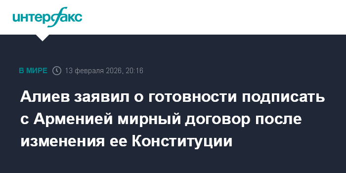 "Вы знаете, что это не от нас зависит (сроки подписания мирного договора - ИФ). Наша позиция известна, она доведена до армянской стороны. В Конституцию Армении должны быть внесены изменения. Как только эти изменения будут сделаны, мы можем подписать мирный договор на следующий день", - сказал Алиев в пятницу азербайджанским журналистам в Мюнхене, отвечая на вопрос о возможности подписания мирного договора уже в 2026 году.