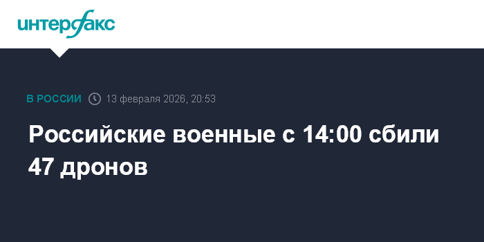 Москва. 13 февраля. INTERFAX.RU - Средства противовоздушной обороны с 14:00 до 20:00 по Москве сбили 47 украинских беспилотников над тремя российскими регионами, сообщили в Минобороны России.
