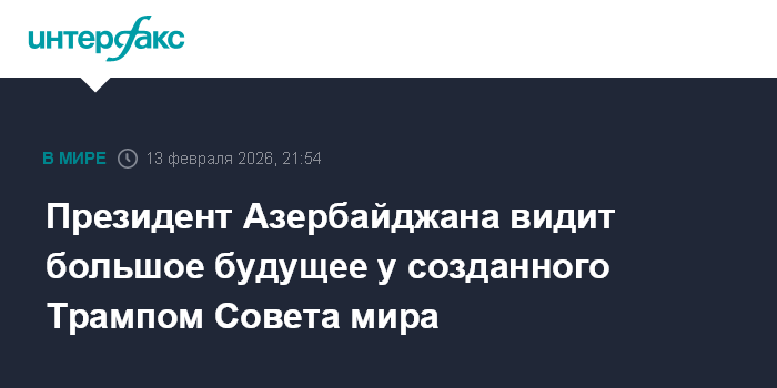Москва. 13 февраля. INTERFAX.RU - Совет мира, созданный по предложению президента США Дональда Трампа, имеет большое будущее, считает президент Азербайджана Ильхам Алиев. Он сказал об этом азербайджанским журналистам в Мюнхене.