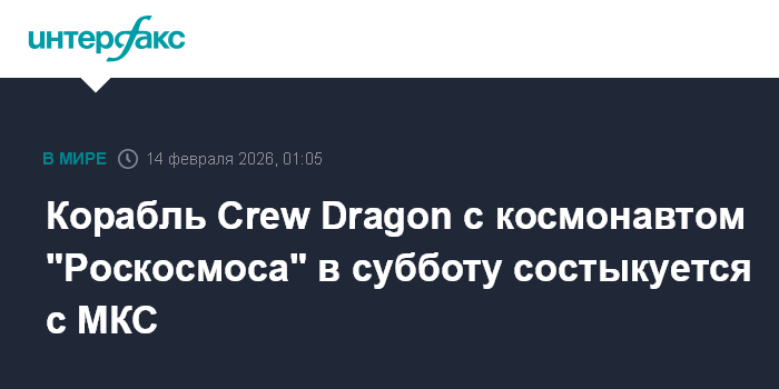 Москва. 14 февраля. INTERFAX.RU - Корабль Crew Dragon с миссией Crew-12, выведенный на орбиту накануне, в субботу состыкуется с Международной космической станцией (МКС), сообщает NASA.