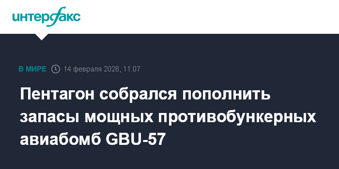 Москва. 14 февраля. INTERFAX.RU - Пентагон собирается пополнить запасы управляемых авиабомб с проникающим боеприпасом большой мощности GBU-57, которые применялись в июне прошлого года во время нанесения ударов по иранским подземным ядерным объектам, сообщило издание Air and Space Forces Magazine.