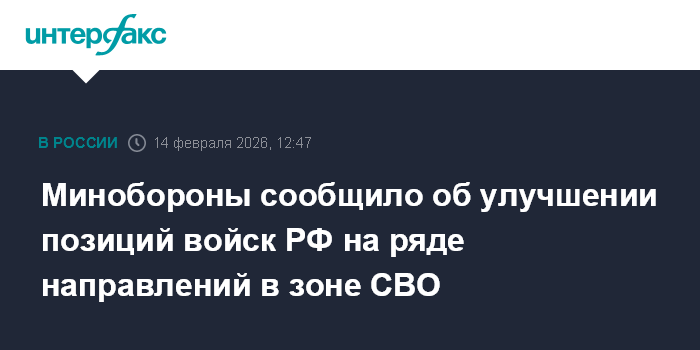 Москва. 14 февраля. INTERFAX.RU - Подразделения группировок войск "Север" и "Южная" улучшили положение в зоне СВО, группировки "Запад" и "Центр" заняли более выгодные рубежи и позиции, заявили в Минобороны России в субботу.