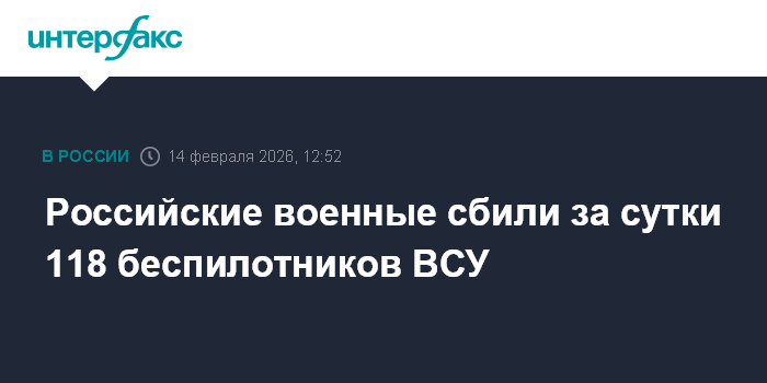 Москва. 14 февраля. INTERFAX.RU - Российские военные в течение суток сбили 118 беспилотных летательных аппаратов самолетного типа, сообщили в Минобороны РФ в субботу.