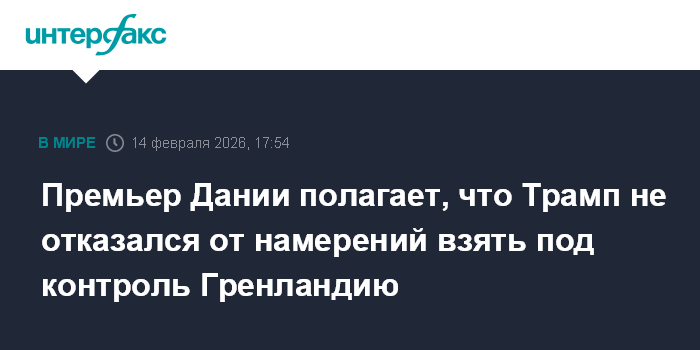 Москва. 14 февраля. INTERFAX.RU - Премьер Дании Метте Фредирексен в субботу заявила, что, по ее мнению, американский президент Дональд Трамп по-прежнему преследует цель присоединить Гренландию - самоуправляемую датскую территорию - к США.