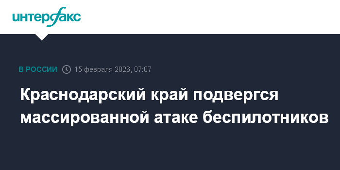 Москва. 15 февраля. INTERFAX.RU - Краснодарский край в ночь на воскресенье подвергся массированной атаке со стороны Украины, два человека ранены, есть очаги возгорания, сообщил утром в воскресенье губернатор региона Вениамин Кондратьев.