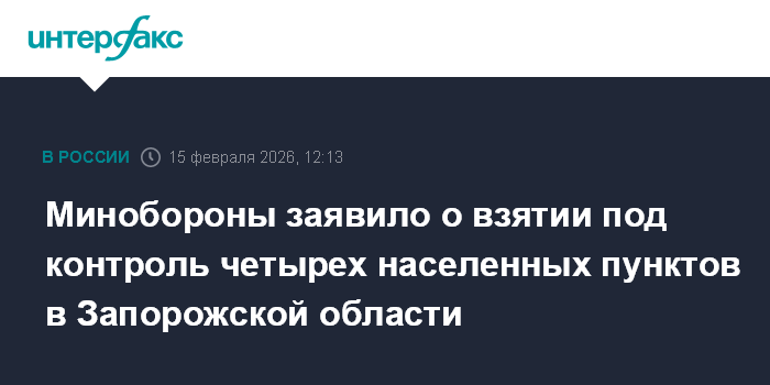 Москва. 15 февраля. INTERFAX.RU - Российские военнослужащие взяли под контроль населенные пункты Цветковое, Запасное, Магдалиновка и Приморское в Запорожской области, заявили в Минобороны России в воскресенье.