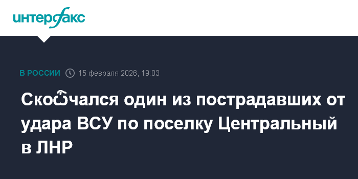 Москва. 15 февраля. INTERFAX.RU - Один из пострадавших в результате удара ВСУ по поселку Центральный в Луганской народной республике мирных жителей скончался в больнице, сообщила министр здравоохранения ЛНР Наталия Пащенко.