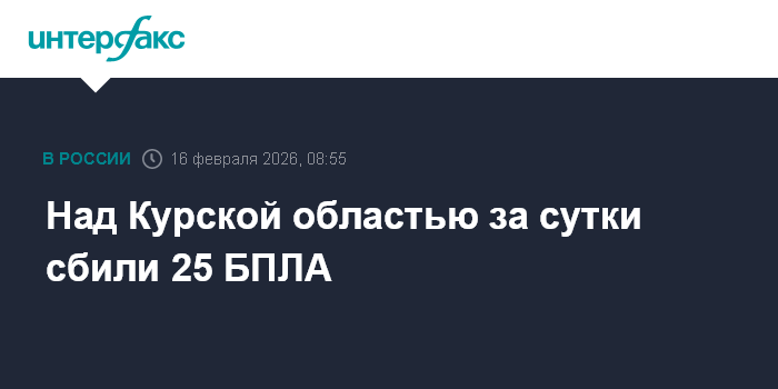 Москва. 16 февраля. INTERFAX.RU - Над Курской областью с 9 часов утра 15 февраля до 7 утра 16 февраля было сбито 25 беспилотников разного типа, сообщил губернатор региона Александр Хинштейн.