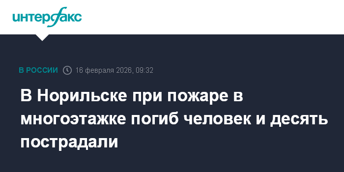Москва. 16 февраля. INTERFAX.RU - В Норильске в воскресенье вечером случился пожар в девятиэтажном доме, один человек погиб, еще десять пострадали, сообщили в управлении МЧС по Красноярскому краю.