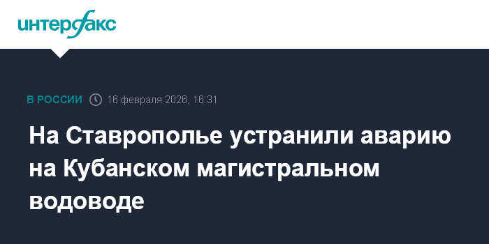 Москва. 16 февраля. INTERFAX.RU - На Ставрополье завершили восстановительные работы на Кубанском магистральном водоводе, авария на котором произошла 12 февраля и привела к ограничению водоснабжения в городах Кавказских Минеральных Вод, сообщил глава Ставропольского края Владимир Владимиров.