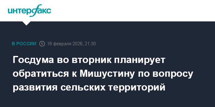 Москва. 16 февраля. INTERFAX.RU - Госдума на заседании во вторник рассмотрит обращение к председателю правительства РФ Михаилу Мишустину по вопросу комплексного развития сельских агломераций, сообщил председатель Госдумы Вячеслав Володин.