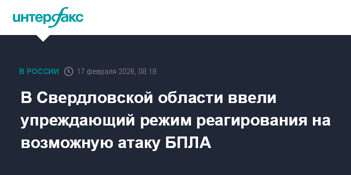 Москва. 17 февраля. INTERFAX.RU - В Свердловской области объявлен упреждающий режим реагирования на возможную атаку БПЛА объявлен в Свердловской области, сообщает Департамент информационной политики региона.