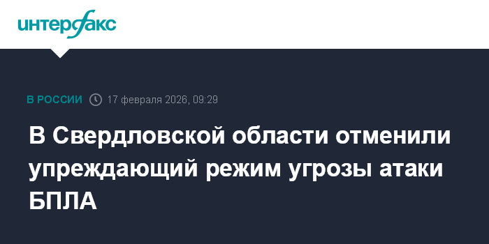 Москва. 17 февраля. INTERFAX.RU - В Свердловской области отменили упреждающий режим реагирования на возможную атаку БПЛА, сообщил Департамент информационной политики региона.