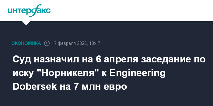 Москва. 17 февраля. INTERFAX.RU - Арбитражный суд Москвы назначил на 6 апреля предварительное заседание по иску ПАО "Норильский никель" к Engineering Dobersek GmbH (Германия) в лице филиала ООО "Инжиниринг Доберсек ГмбХ", Германия (Москва) о взыскании 7 млн евро.