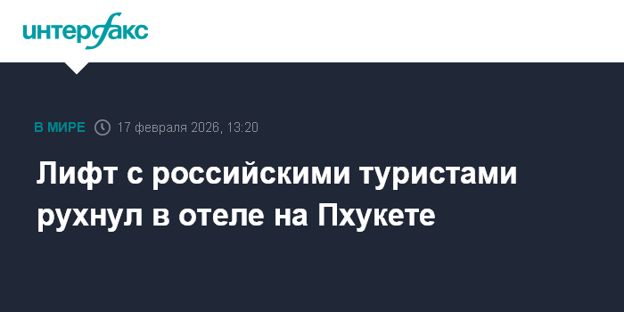 Москва. 17 февраля. INTERFAX.RU - Шестеро россиян, среди которых двое несовершеннолетних 8 и 16 лет, пострадали в результате падения лифта в отеле Casa del Sol на Пхукете в Таиланде, сообщает Phuket News.