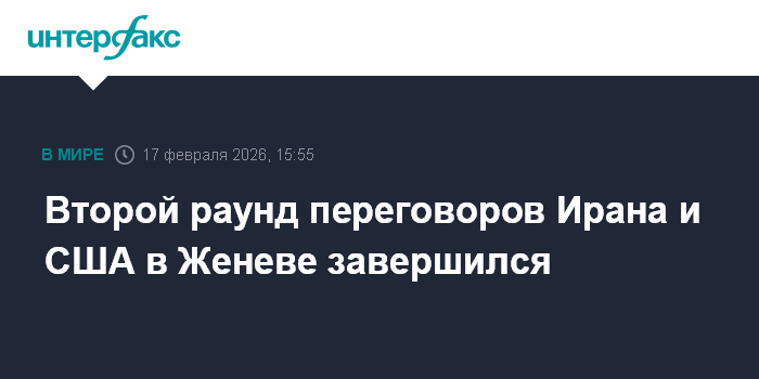 Москва. 17 февраля. INTERFAX.RU - Второй раунд непрямых переговоров в Женеве между Вашингтоном и Тегераном по ядерной проблематике завершился во вторник. Об этом написал журналист портала Axios Барак Равид в соцсети X, ссылаясь на неназванного американского чиновника.
