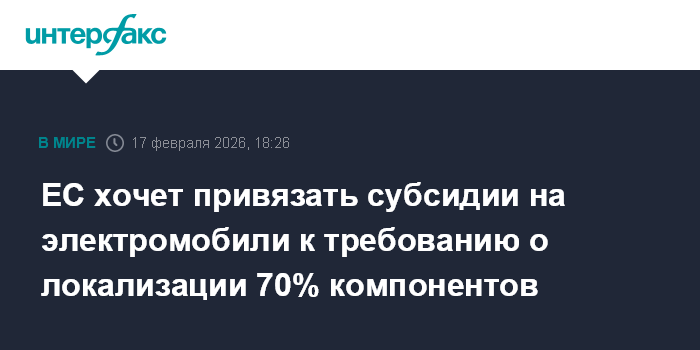 Москва. 17 февраля. INTERFAX.RU - Европейская комиссия (ЕК) предлагает привязать право производителей электромобилей на субсидии к локализации не менее 70% компонентов машин, пишет газета Financial Times со ссылкой на проект закона об ускорении промышленности (Industrial Accelerator Act), с которым она ознакомилась.