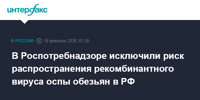 Москва. 18 февраля. INTERFAX.RU - Риски распространения рекомбинантного вируса оспы обезьян, о двух случаях заболевания которым сообщила Всемирная организация здравоохранения, в России исключены, имеющиеся в РФ тест-системы способны выявлять вирус оспы обезьян, включая новые генетические варианты, сообщили в Роспотребнадзоре.
