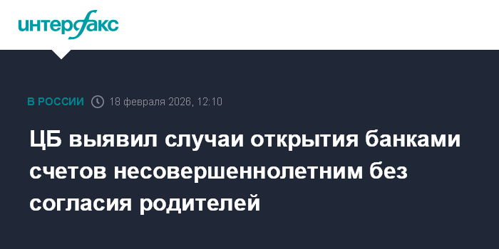 Москва. 18 февраля. INTERFAX.RU - ЦБ РФ выявил случаи открытия некоторыми банками счетов несовершеннолетним (в возрасте от 14 до 18 лет) без согласия их законных представителей, то есть родителей, усыновителей или попечителей, говорится в сообщении регулятора.