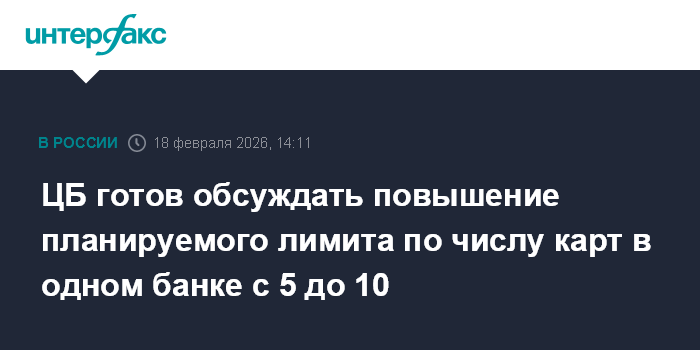 Москва. 18 февраля. INTERFAX.RU - ЦБ РФ готов обсуждать смягчение планируемой к введению нормы, которая лимитирует количество карт одного банка у конкретного пользователя, подняв планку вдвое, сообщила глава регулятора Эльвира Набиуллина.