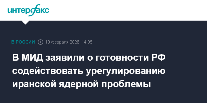 Москва. 18 февраля. INTERFAX.RU - Россия готова содействовать урегулированию иранской ядерной проблемы, реализации потенциальных договоренностей по этому вопросу, заявила официальный представитель МИД РФ Мария Захарова.