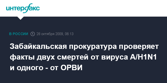 Чита. 28 октября. ИНТЕРФАКС-СИБИРЬ - Прокуратура Забайкальского края в среду приступила к проверке по фактам двух смертных случаев от вируса А/Н1N1 и одного - от тяжелой формы заболевания ОРВИ, сообщил в среду агентству "Интерфакс-Сибирь" руководитель пресс-службы прокуратуры Забайкальского края Анатолий Усков.