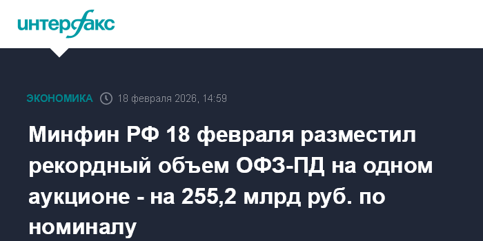 Минфин РФ 18 февраля разместил рекордный объем ОФЗ-ПД на одном аукционе - на 255,2 млрд руб. по номиналу