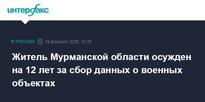 Москва. 18 февраля. INTERFAX.RU - Житель Мурманской области приговорен к 12 годам лишения свободы по делу о государственной измене, сообщила пресс-служба региональной прокуратуры.