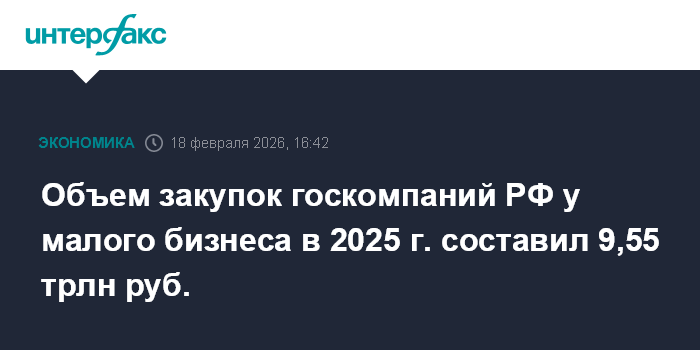 Москва. 18 февраля. INTERFAX.RU - Объем закупок крупнейших госкомпаний РФ у субъектов малого и среднего предпринимательства (МСП) в 2025 году составил 9,55 трлн рублей, говорится в сообщении "Корпорации МСП" (занимается, в частности, мониторингом закупок крупнейших госкомпаний у малого бизнеса).