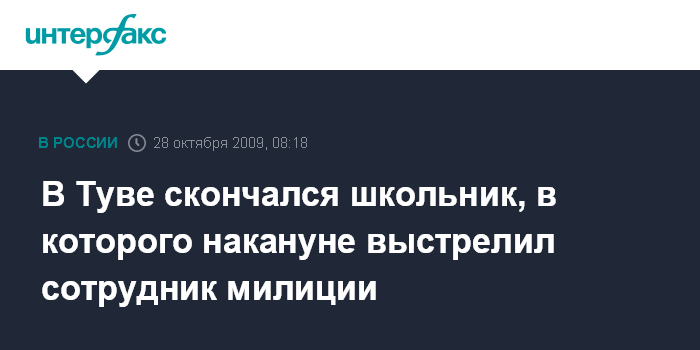 Москва. 28 октября. INTERFAX.RU - Учащийся 11-го класса, которого ранил во вторник сотрудник ГИБДД, скончался в больнице в Туве.